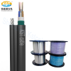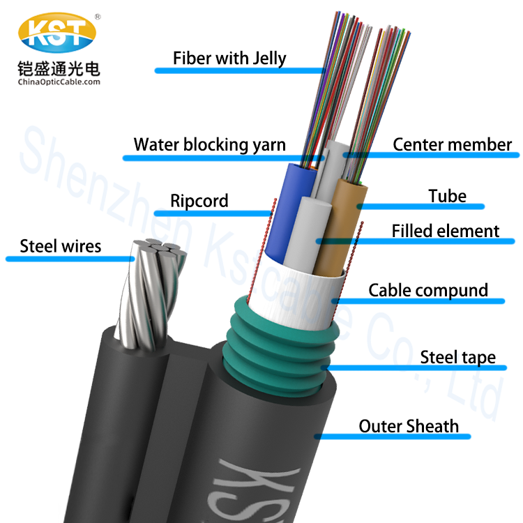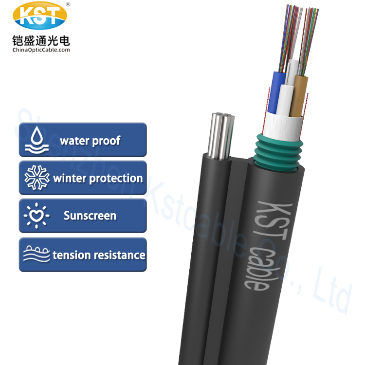 Les fibres, de type monomode ou multimode, sont placées dans un tube lâche en plastique à haut module. Les tubes intérieurs sont remplis d'un composé de remplissage résistant à l'eau. Un FRP se trouve au centre du noyau en tant qu'élément de renforcement non métallique. Les tubes (et les charges) sont torsadés autour de l'élément de renforcement pour former un noyau de câble compact et circulaire. Après l'application du PSP autour du noyau du câble, un fil de blocage de l'eau et un composé de câble protègent le câble de l'eau. Cette partie du câble, accompagnée des fils torsadés en tant que partie de support, est complétée par une gaine en polyéthylène (HD PE) pour former une structure en forme de 8. Les cordons de déchirement facilitent le dénudage de la fibre lors de l'installation. Ce type de câble est spécifiquement conçu pour une installation aérienne autoportante.