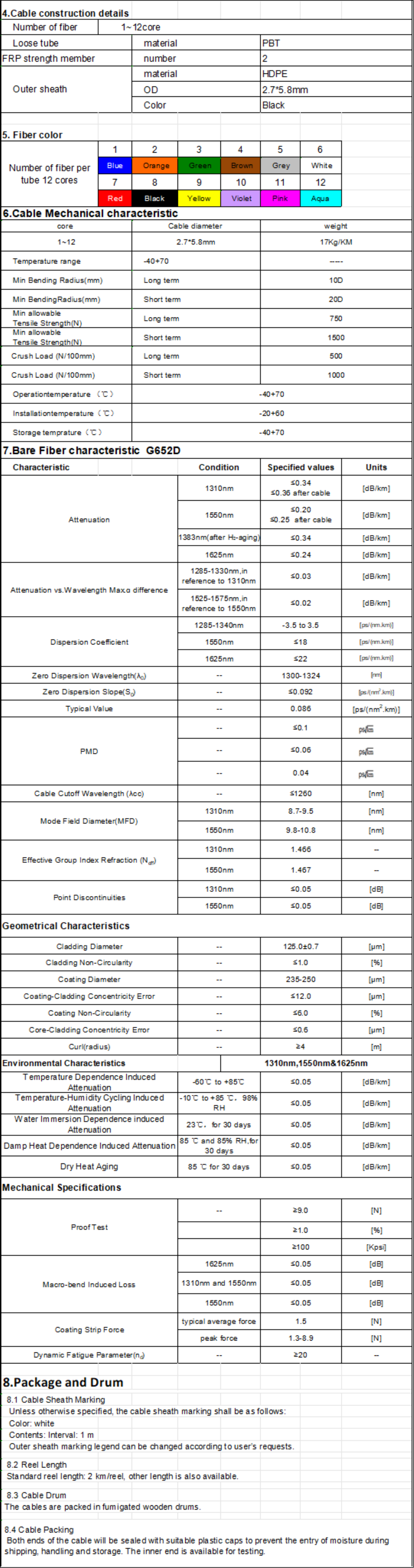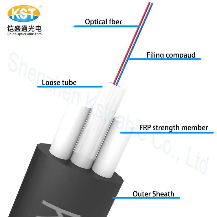 Les fibres sont positionnées dans un tube lâche en plastique à haut module. Les tubes sont remplis d'un composé de remplissage résistant à l'eau. Deux FRP sont placés sur les deux côtés du tube. Le câble est complété par une gaine en polyéthylène (HDPE) qui a une excellente capacité de résistance à la corrosion.