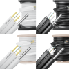 Les fibres optiques (1-6F) sont positionnées au centre du câble, Deux fils d'acier parallèles renforçant la résistance à la tension du câble sont placés des deux côtés du câble, un fil d'acier unique supplémentaire recouvert d'une gaine extérieure en PE en tant qu'élément de renforcement autoportant supplémentaire est également appliqué, puis le câble est complété avec une gaine extérieure LSZH noire (ou personnalisée) ignifuge pour être un produit intégré.