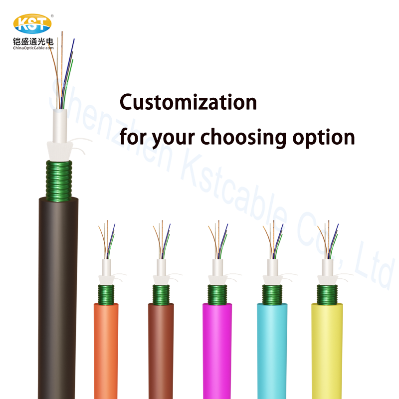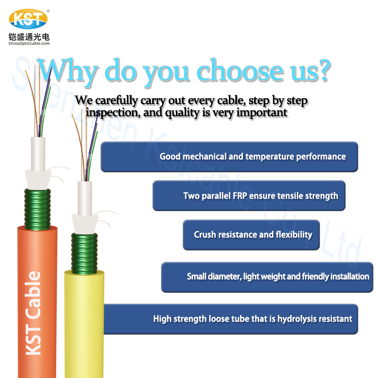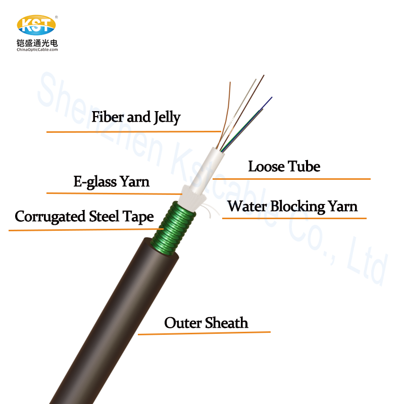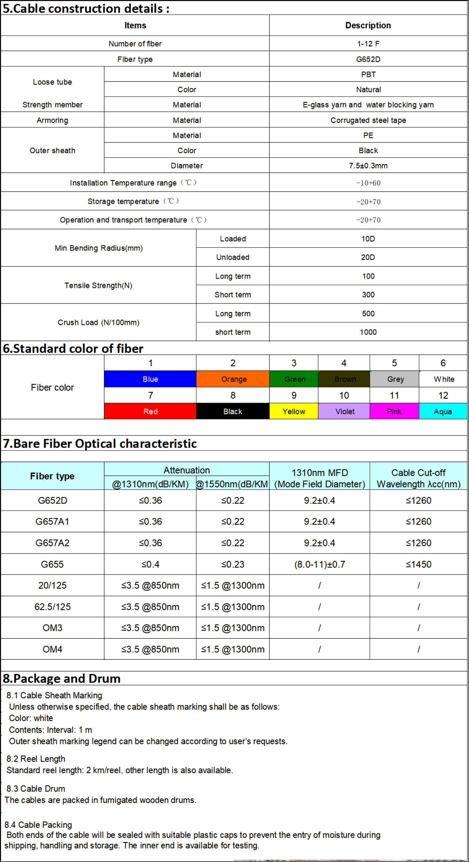 Le nombre de fibres du câble est normalement de 1 à 12 cœurs, les fibres et la gelée sont remplies dans un tube lâche en plastique à module élevé pour former une structure de tube central, à l'extérieur du tube se trouve un fil de verre E et plusieurs fils de blocage d'eau dispersés pour empêcher l'humidité, une couche de ruban d'acier ondulé enveloppe l'extérieur des unités de tube pour empêcher les dommages causés par les rats, résistance à l'humidité et également, avec la fonction du fil de verre E, renforce la résistance à la traction du câble, la gaine extérieure en PE suprême intègre tout ce qui précède pour former un câble optique compact