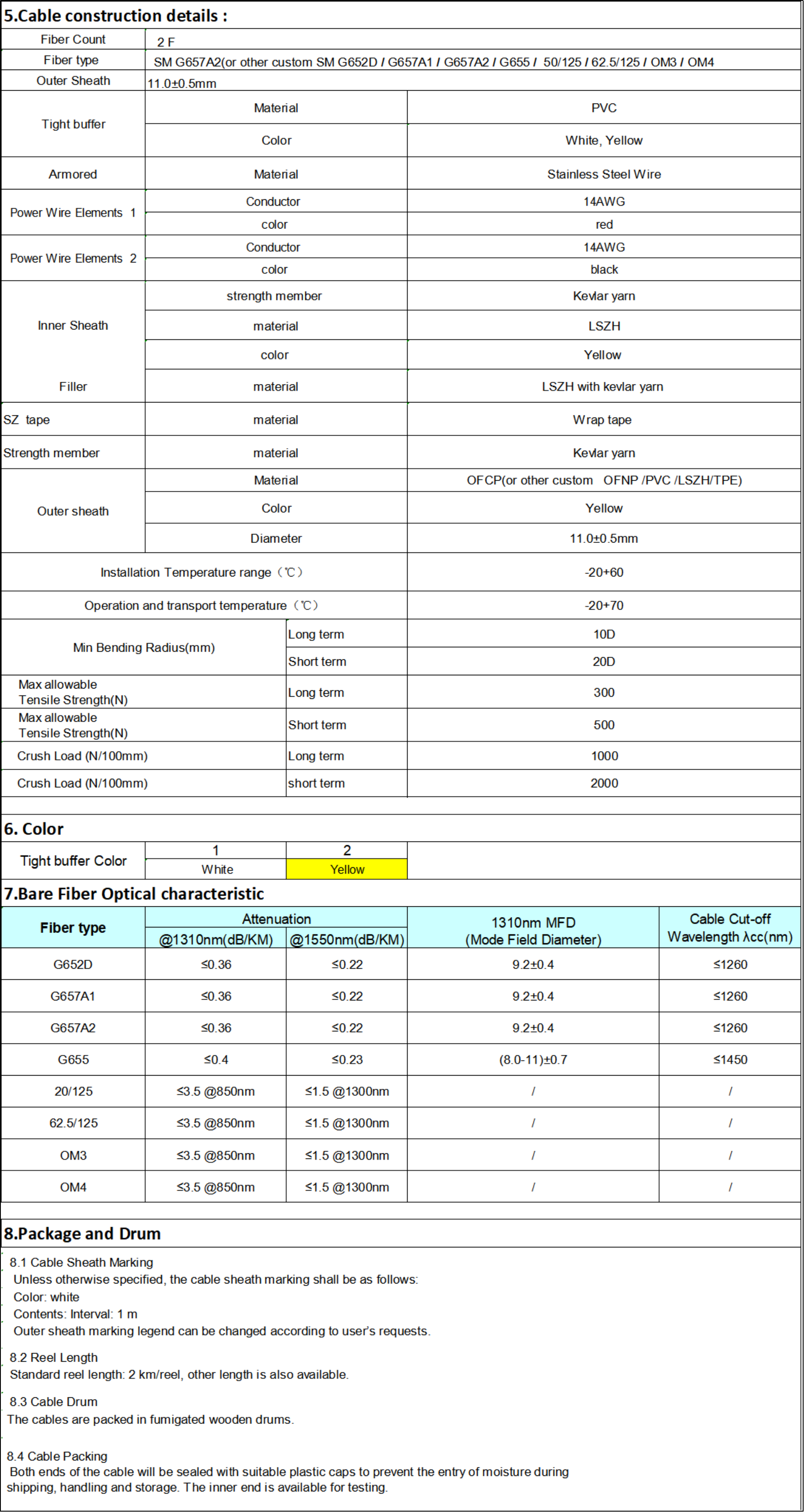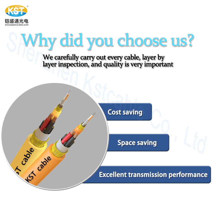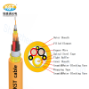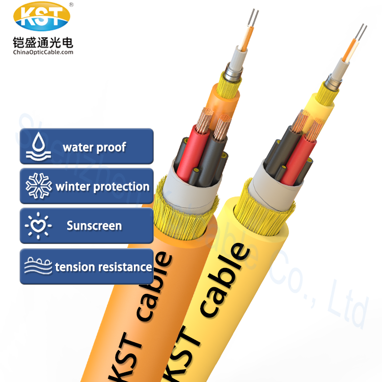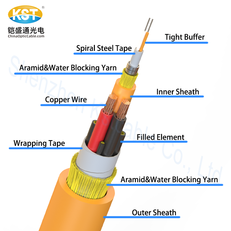 La structure globale de ce câble se compose de 3 unités fonctionnelles, 3 unités d'éléments remplis et 3 couches externes. L'unité fonctionnelle jaune avec 2 tampons serrés, une couche de ruban en acier blindé en spirale anti-rat enveloppant l'extérieur du tampon serré, ainsi qu'une couche de fil de Kevlar renforcent la résistance à la traction du câble, l'unité jaune la plus externe étant une gaine LSZH, la fonction principale de l'unité jaune étant la transmission du signal ; Les unités fonctionnelles rouge et noire ont la même structure de fil de cuivre 18AWG interne et de gaine externe OFCP (ou PVC personnalisé / LSZH / OFNP), la fonction principale du fil de cuivre étant conductrice et de mise à la terre. Pour garantir la stabilité structurelle et renforcer la résistance à la traction de l'ensemble du câble, 3 éléments remplis (fil de Kevlar + gaine extérieure en PVC) sont placés à l'intérieur du câble. Pour les 3 couches externes, y compris le ruban d'enveloppement interne, le fil de Kevlar intermédiaire et la gaine extérieure en TPE (ou OFCP / PVC / LSZH / OFNP) la plus externe, ainsi que tous les contenus ci-dessus, complétés pour former un câble intégré.