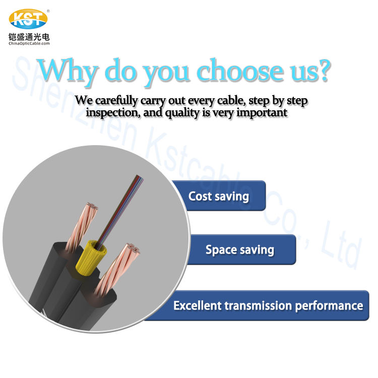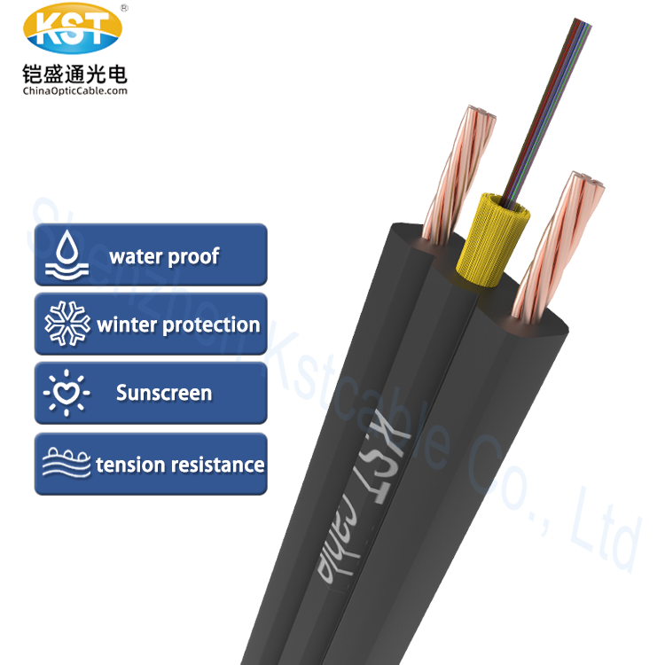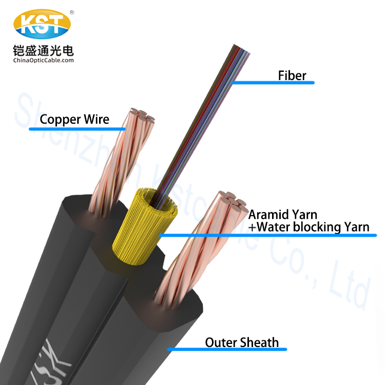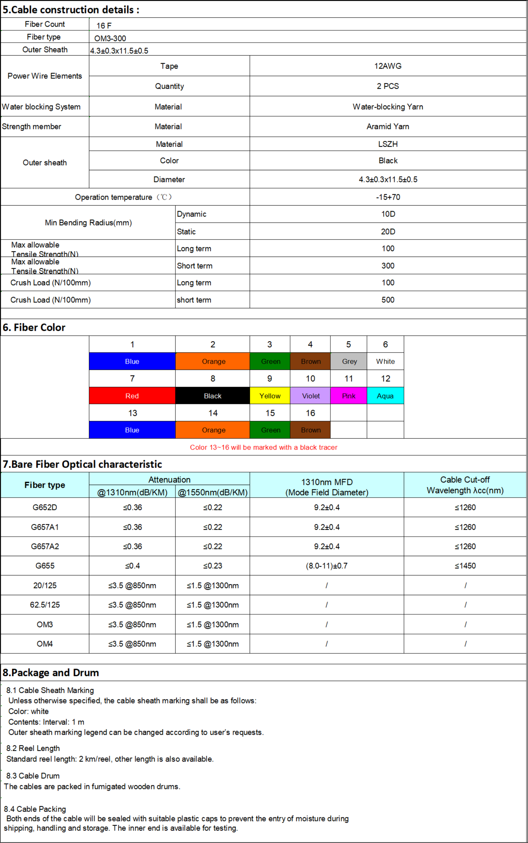 L'unité fonctionnelle jaune avec 16 fibres au milieu, et le fil d'aramide et le fil de blocage d'eau renforcent la résistance à la traction du câble, la fonction principale de l'unité jaune est la transmission du signal ; 2 éléments de fil de cuivre torsadés sont des deux côtés du câble, la fonction principale du fil de cuivre est conductrice et de mise à la terre ; le summum du câble est une gaine extérieure LSZH, complétant ainsi un câble à fibres optiques intégré