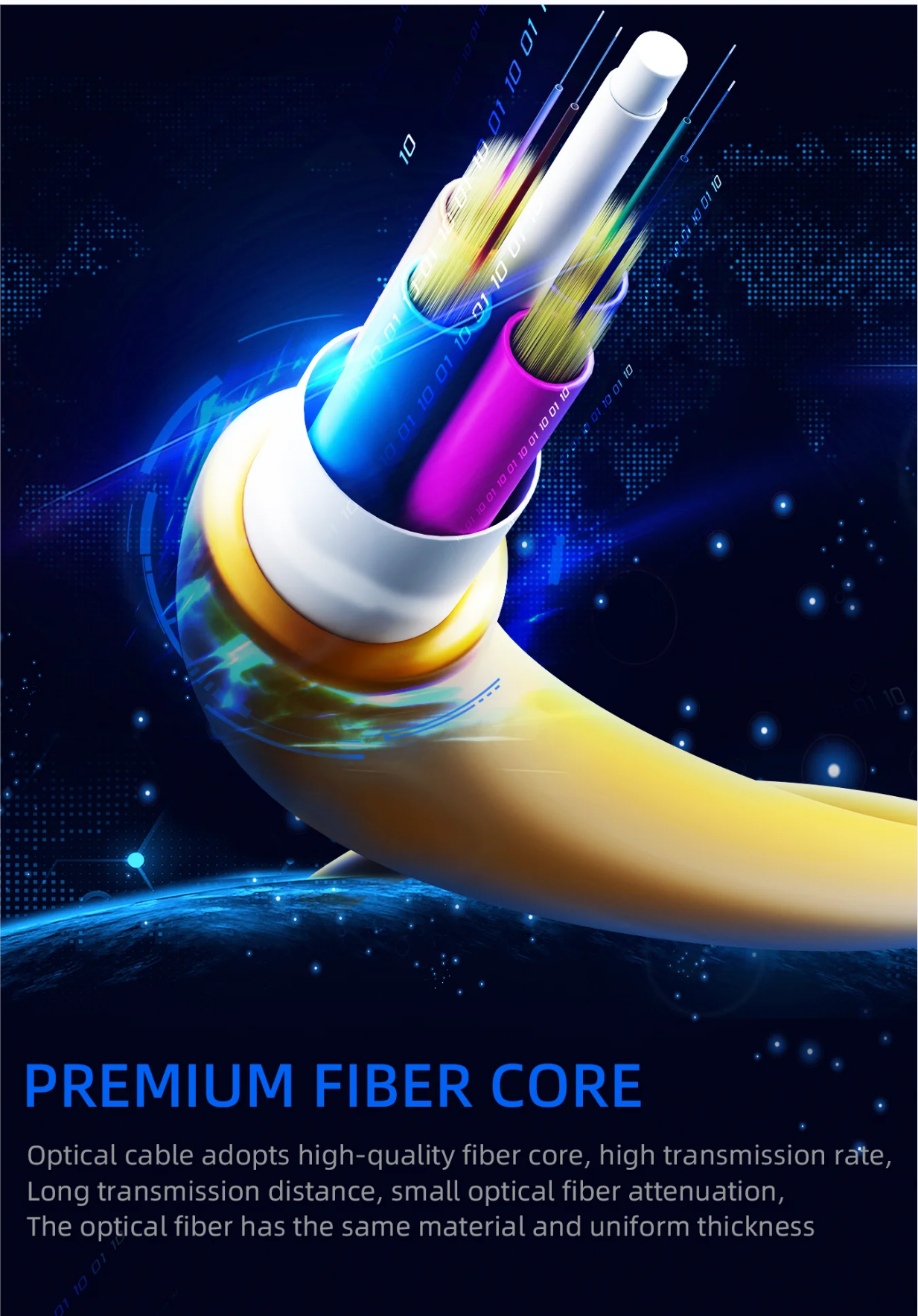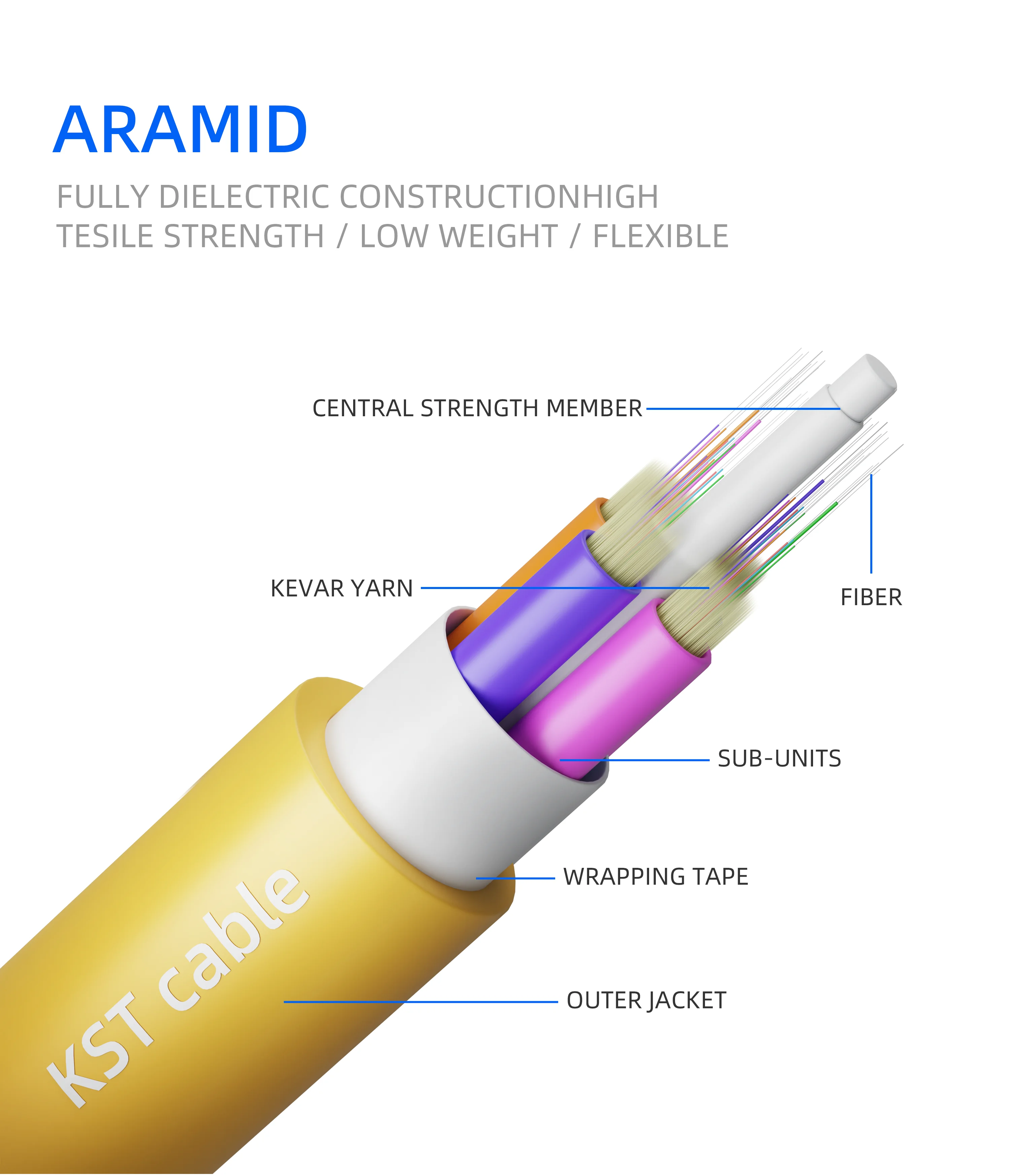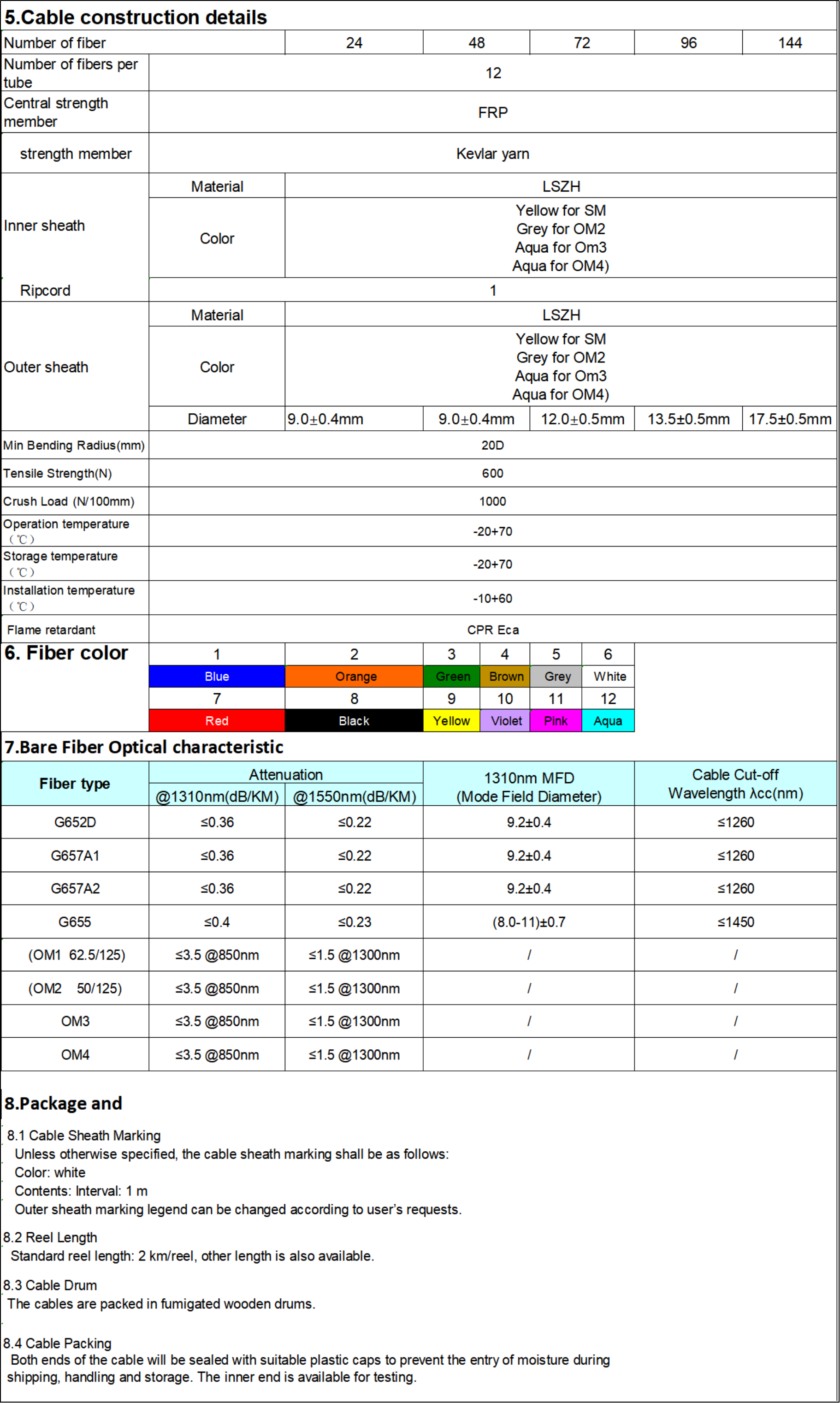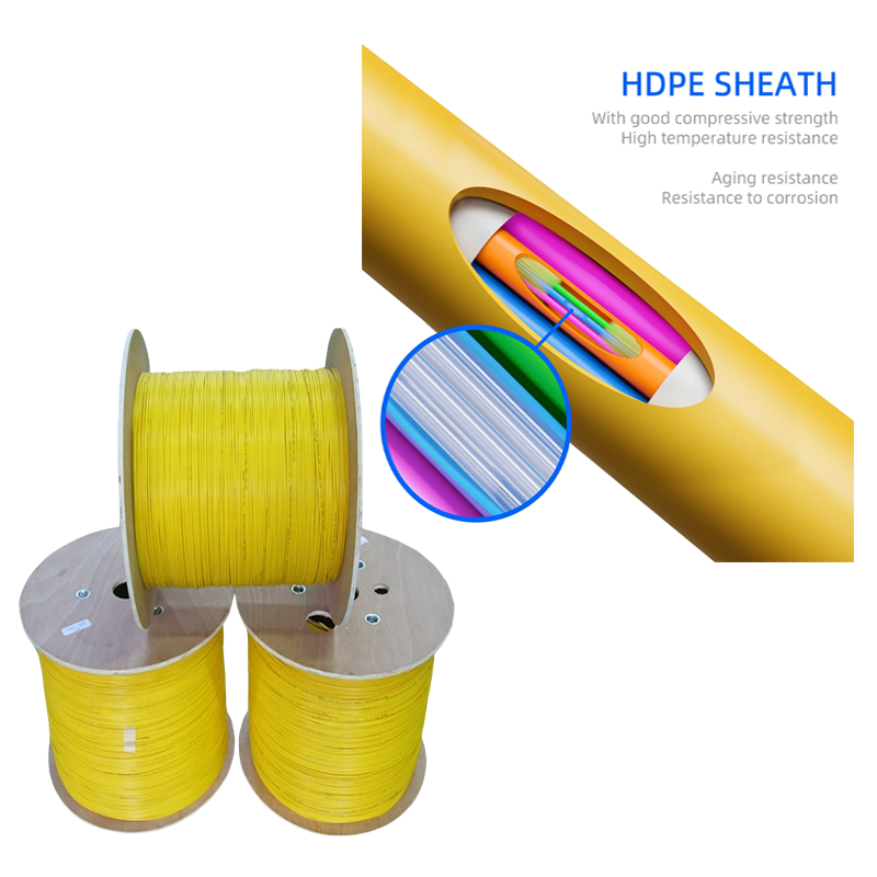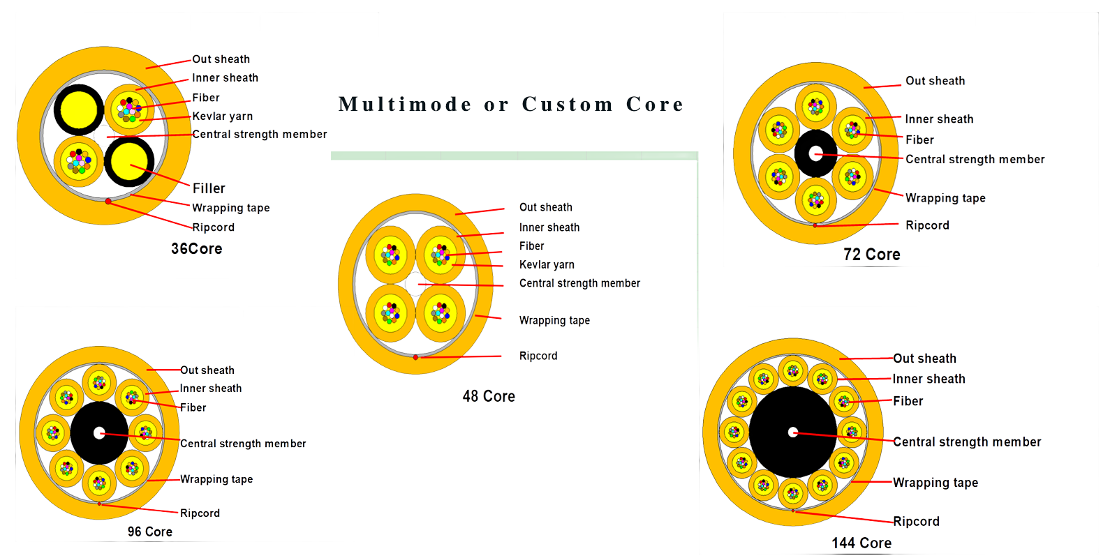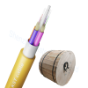 Au milieu du câble se trouve un élément central de résistance FRP, 12 fibres accompagnées de fil de Kevlar sont remplies dans chaque tube, la couche extérieure de chaque tube est une veste intérieure en PE ou en HDPE, le FRP et le Kevlar fonctionnent comme une force de traction renforçante. Pour rendre la structure du câble plus compacte et étanche, à l'extérieur de ces structures de tubes est souvent enroulée une couche de ruban d'étanchéité imperméable. Si nécessaire, des bâtonnets de remplissage sont souvent utilisés à la place des structures de tubes unitaires pour rendre la structure du câble plus stable. La partie la plus externe du câble est complétée par une gaine en PE ou en HDPE.