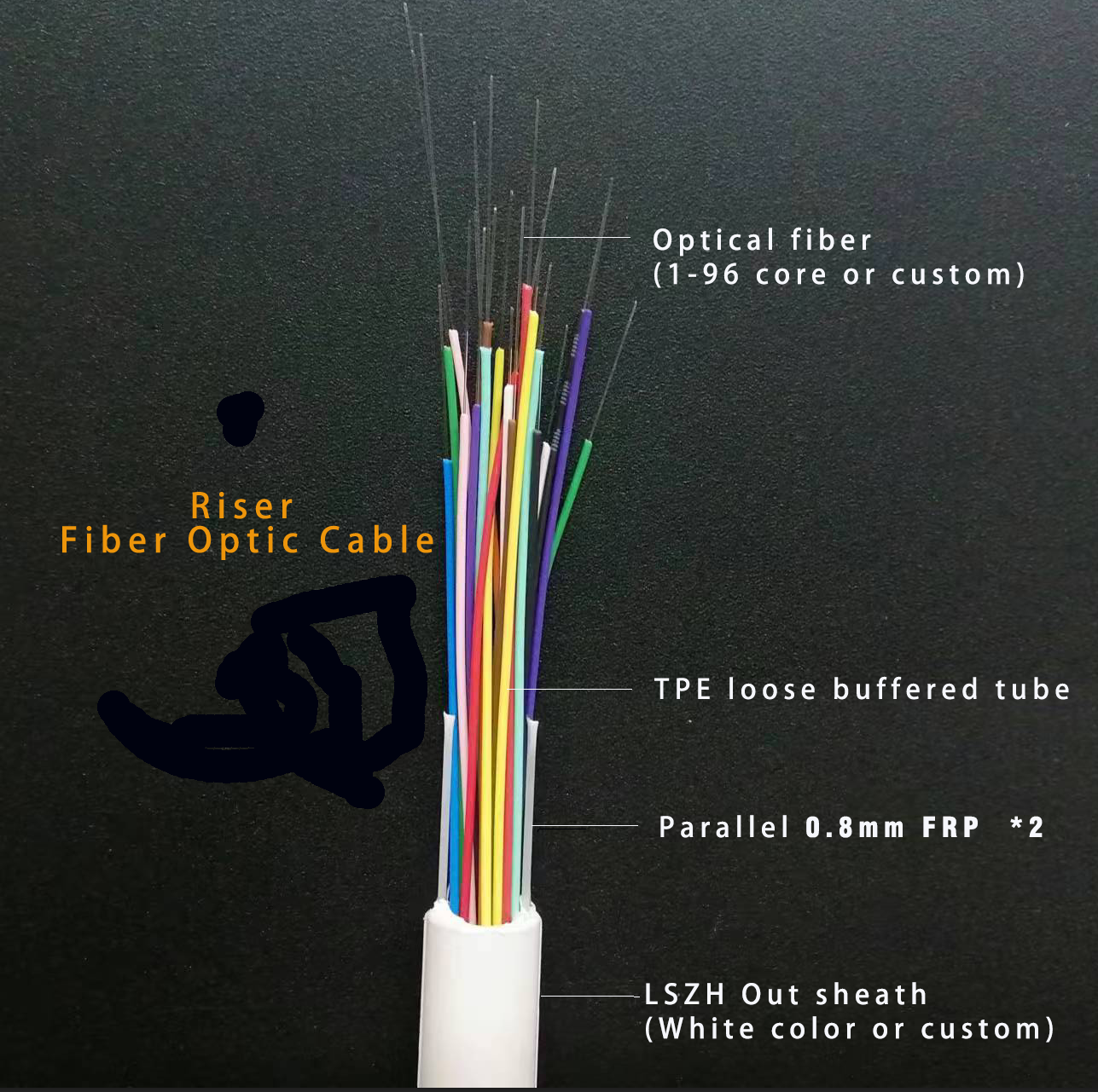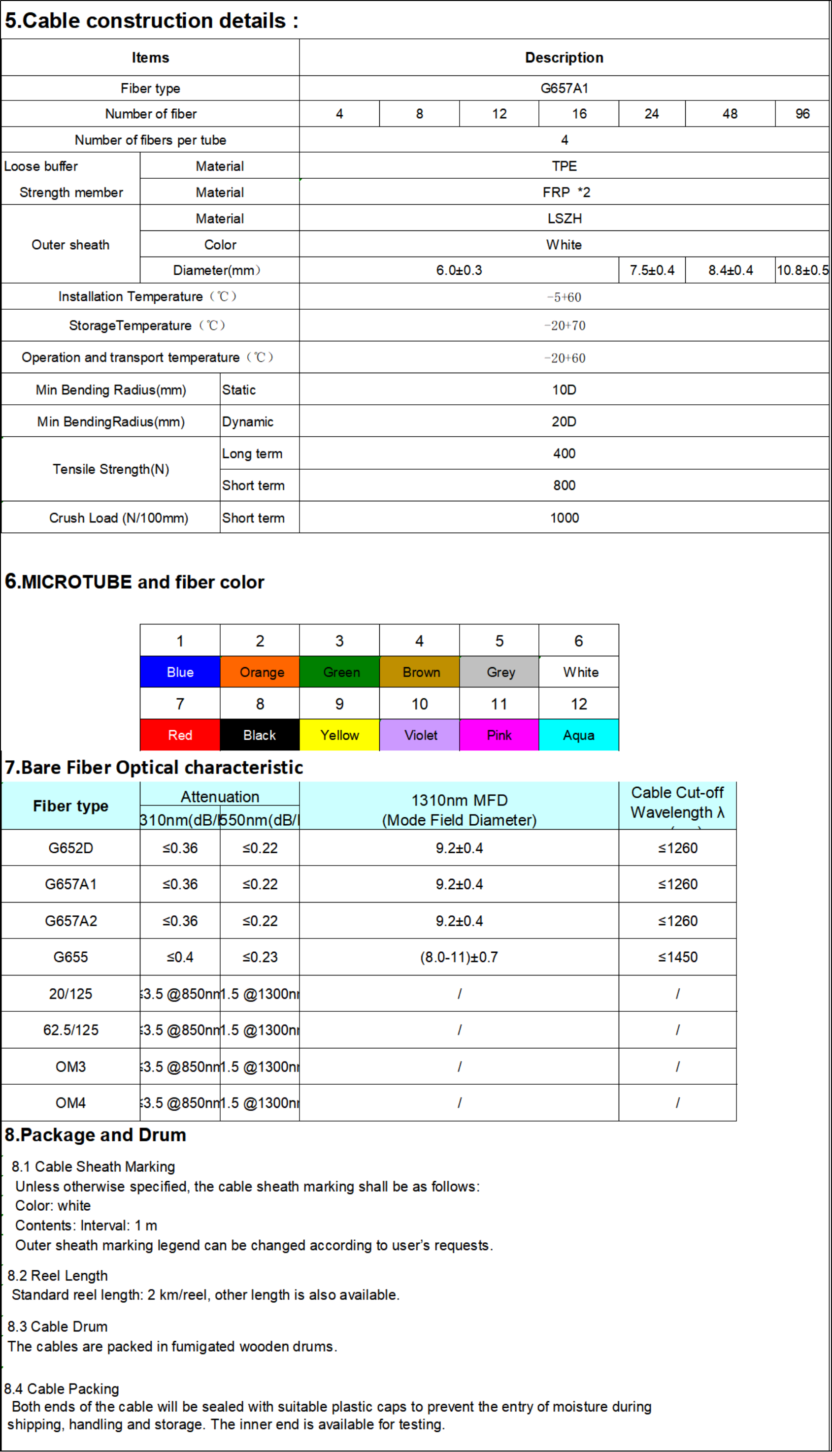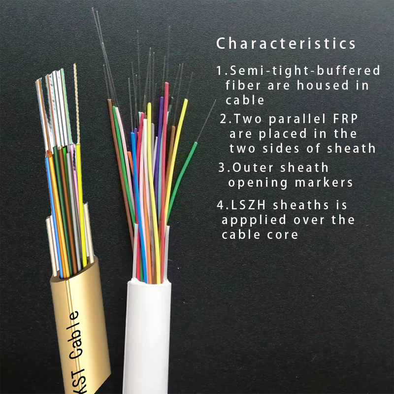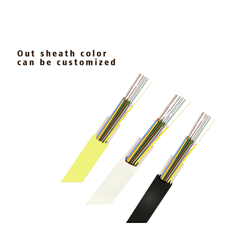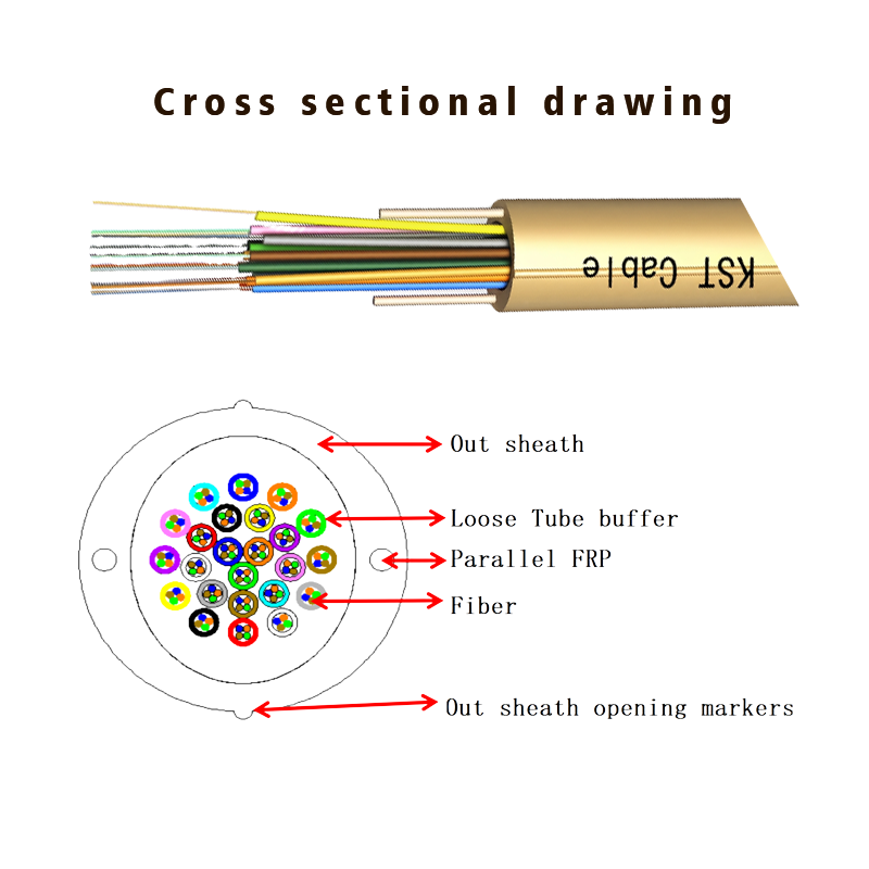 Chaque unité de tube lâche comprend 4 fibres, un revêtement semi-lâche, qui sont protégées par du TPE. Toutes les unités de tubes lâches sont placées dans la gaine extérieure blanche en PE lâche, Deux FRP sont placés parallèlement de chaque côté de la gaine extérieure blanche, les marqueurs d'ouverture de gaine se trouvent sur deux autres côtés de la gaine.