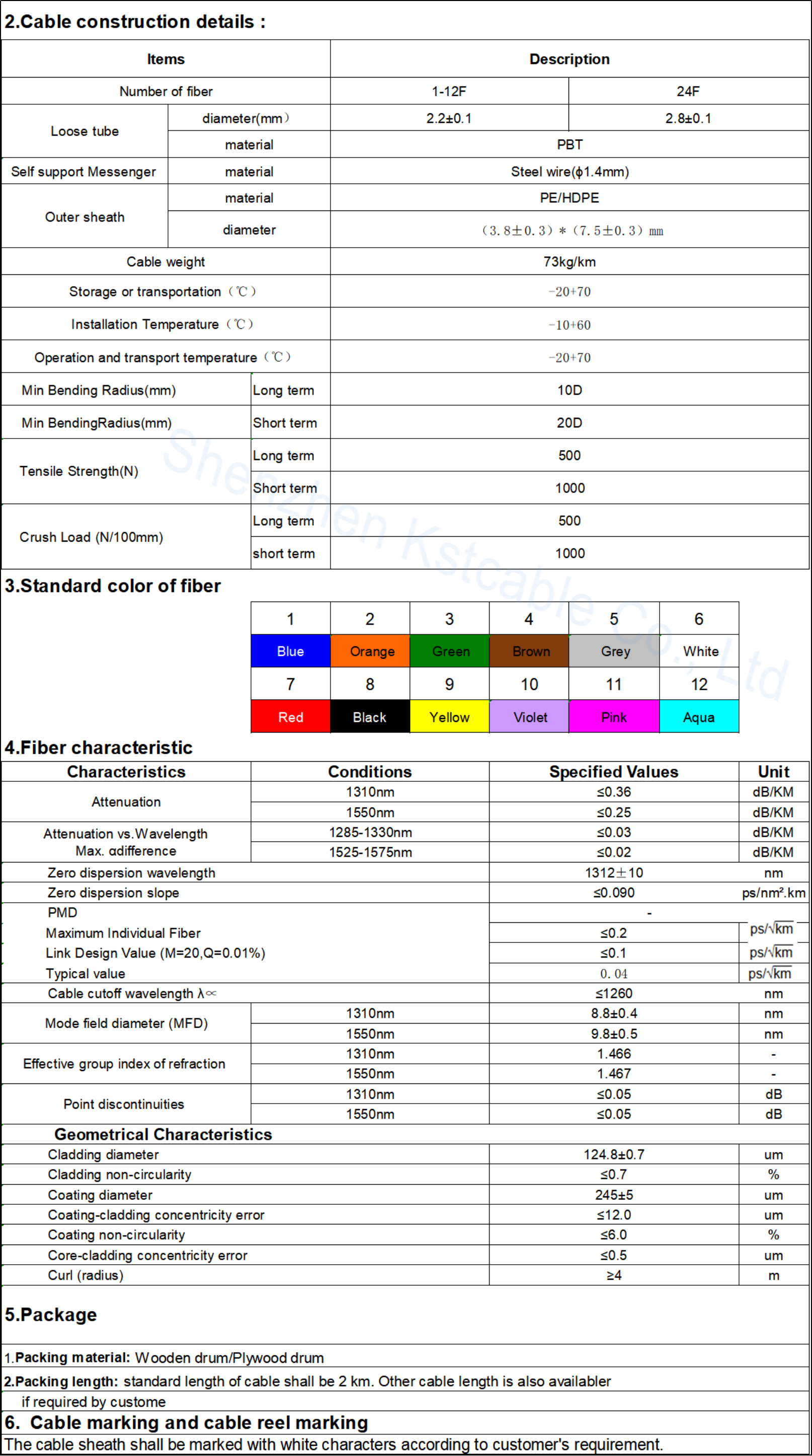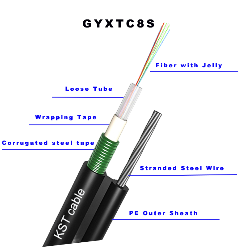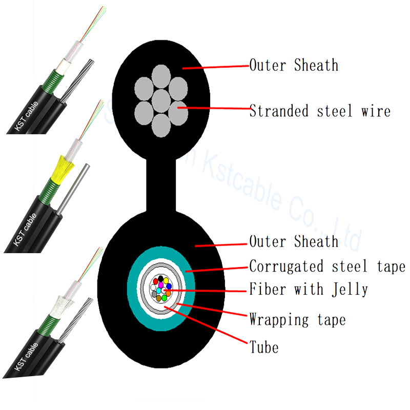 Les fibres sont positionnées dans un tube lâche en plastique à module élevé. Le tube est rempli d'un composé de remplissage résistant à l'eau. Une bande d'acier ondulée sous la gaine extérieure permet d'obtenir un effet anti-rongeurs. Le câble est accompagné d'autres fils torsadés en tant que partie de support, ils sont intégrés par une gaine extérieure en PE pour former une structure en 8.