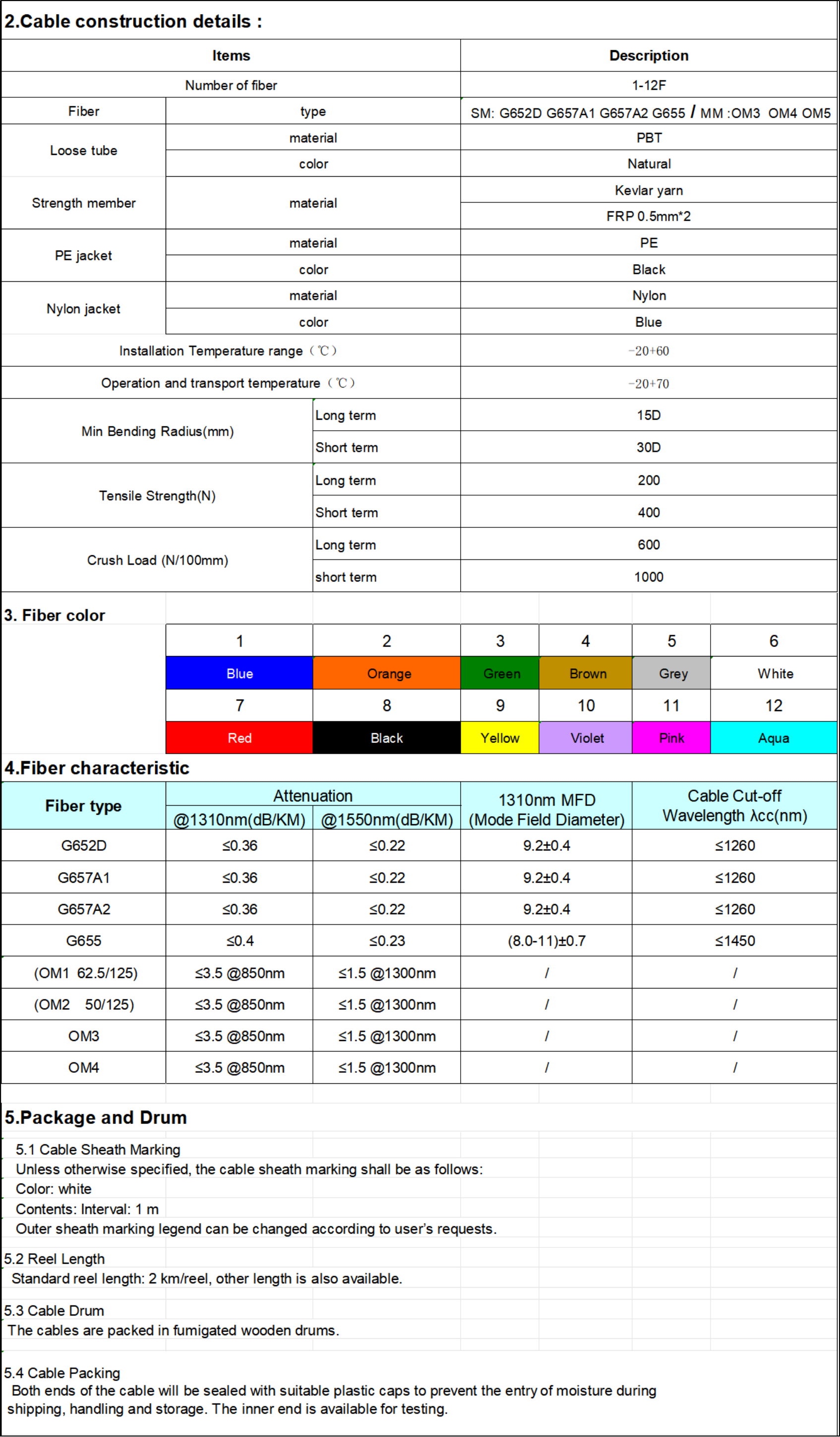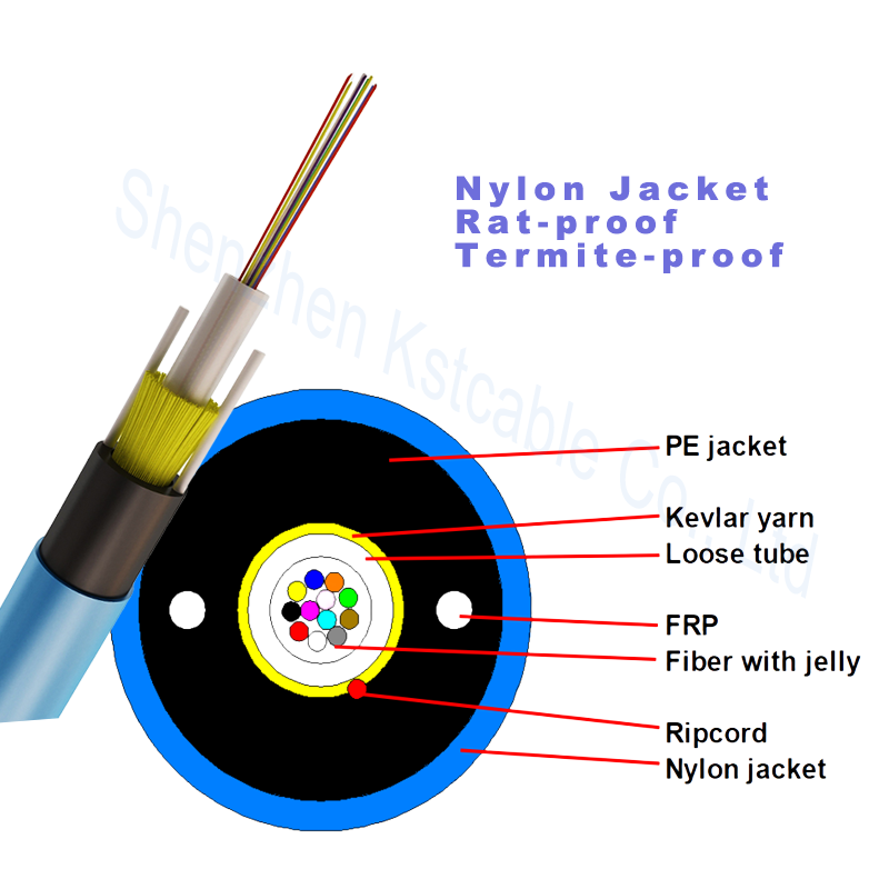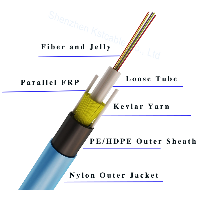 Les fibres sont positionnées dans un tube lâche en plastique à module élevé. Le tube est rempli de gel résistant à l'eau. Le fil de Kelvar est à l'intérieur de la veste extérieure en PE.